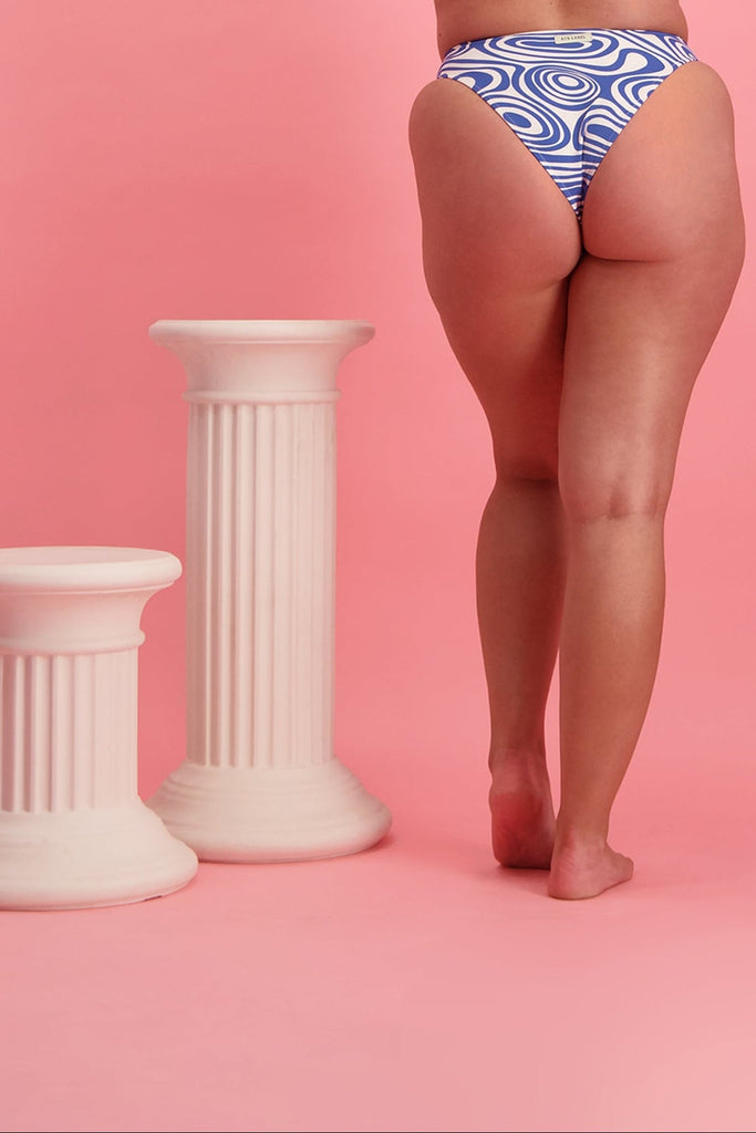 Our '90 inspired new design in our collection. Designed to hug your hips and give your booty a lift, this swimsuit bottom is sure to turn heads on the beach. The Penelope bottom sit at the perfect height just below the belly button, providing ultimate support and comfort. Note: The Terry designs have zigzag gold or silver stitching!